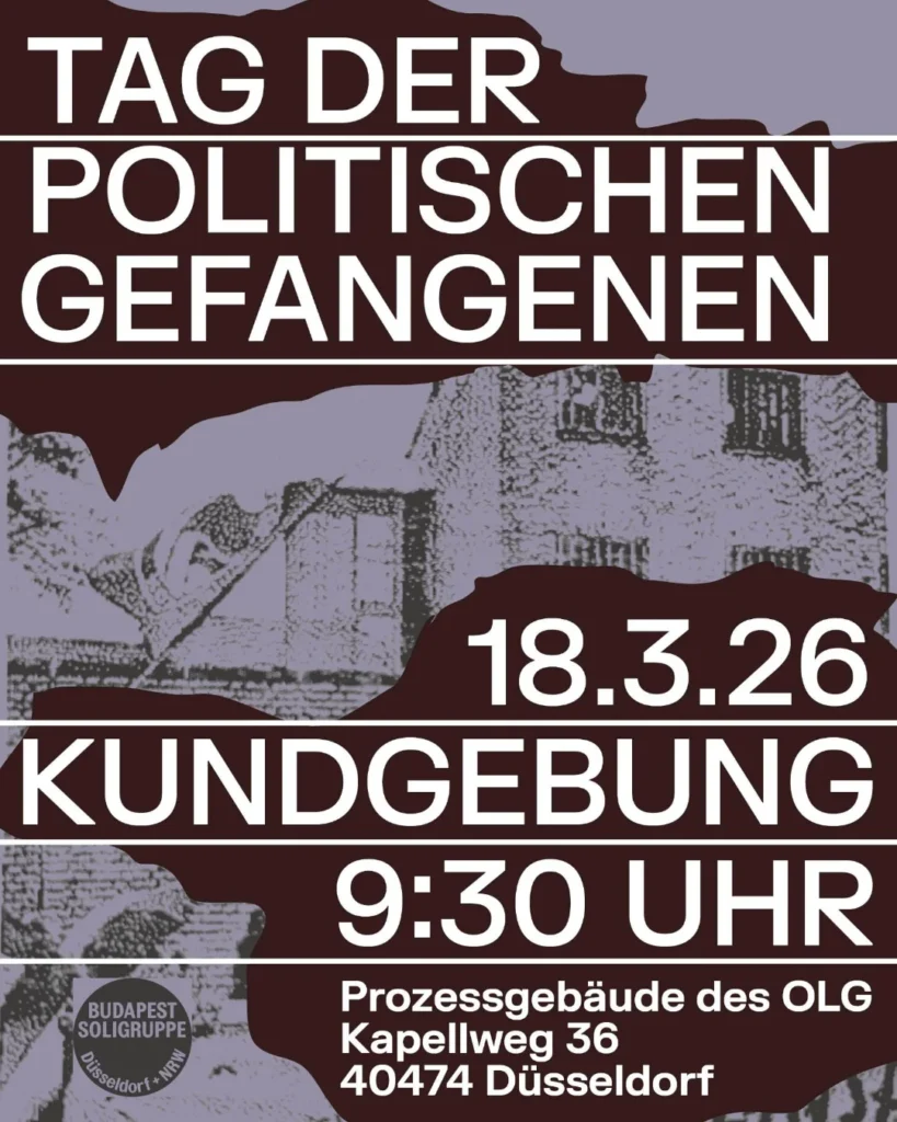 Anlässlich des Tages der politischen Gefangenen am 18. März halten wir eine Kundgebung vor dem Oberlandesgericht Düsseldorf ab, um an die politischen Gefangenen weltweit zu erinnern. Insbesondere widmen wir die Kundgebung unseren angeklagten und inhaftierten Genoss*innen, welche auf Grundlage zweifelhafter Anklagekonstrukte vor dem OLG Düsseldorf verhandelt werden.